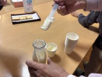 新生酪農さんはバター作り体験。生クリーム70mlを牛乳の空瓶に入れて蓋をしてフリフリ。15分